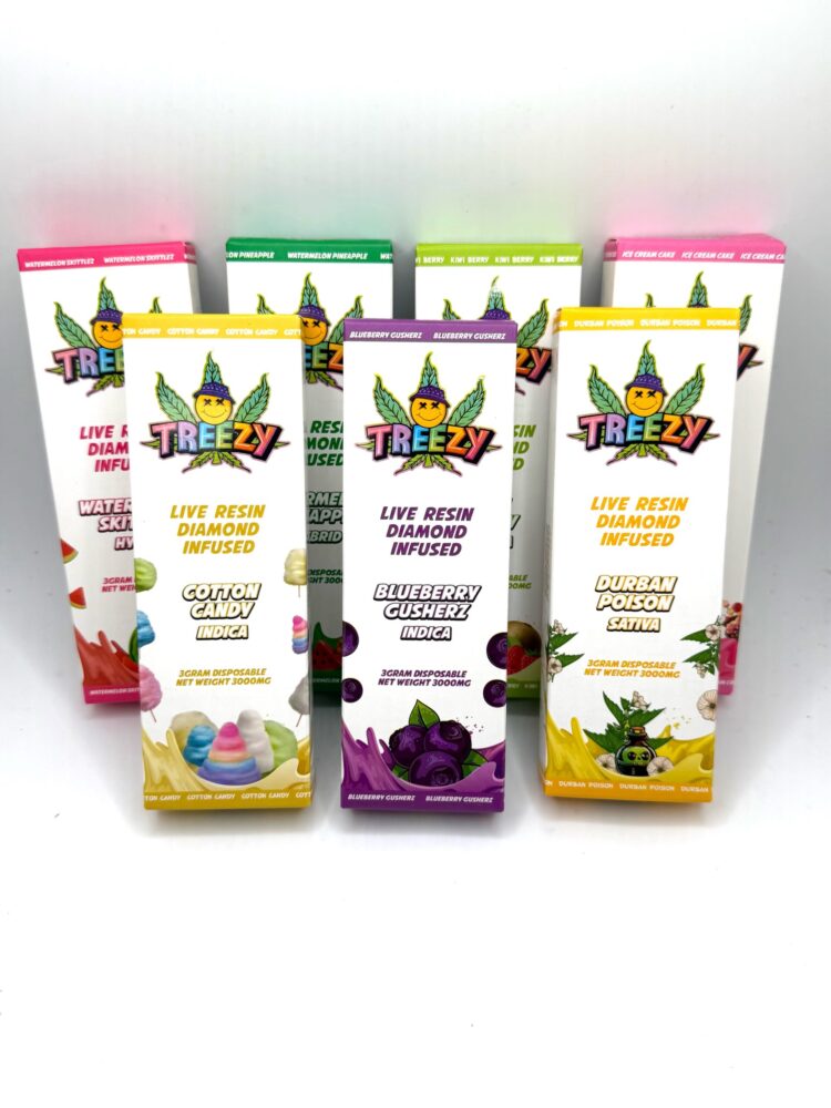 | Treezy 3G Disposable vape | Blue Razburst-Sativa, Blueberry Gusherz-Indica, Cotton Candy-Indica, Durban Poison-Sativa, Gorilla Grape-Indica, Ice Cream Cake-Hybrid, Kiwi Berry-Indica, Peach Rings-Hybrid, Rainbow Beltz-Sativa, Strawberry-Sativa, StrawberryNanna-Hybrid, Watermelon Pineapple-Hybrid, Watermelon Skittlez-Hybrid |